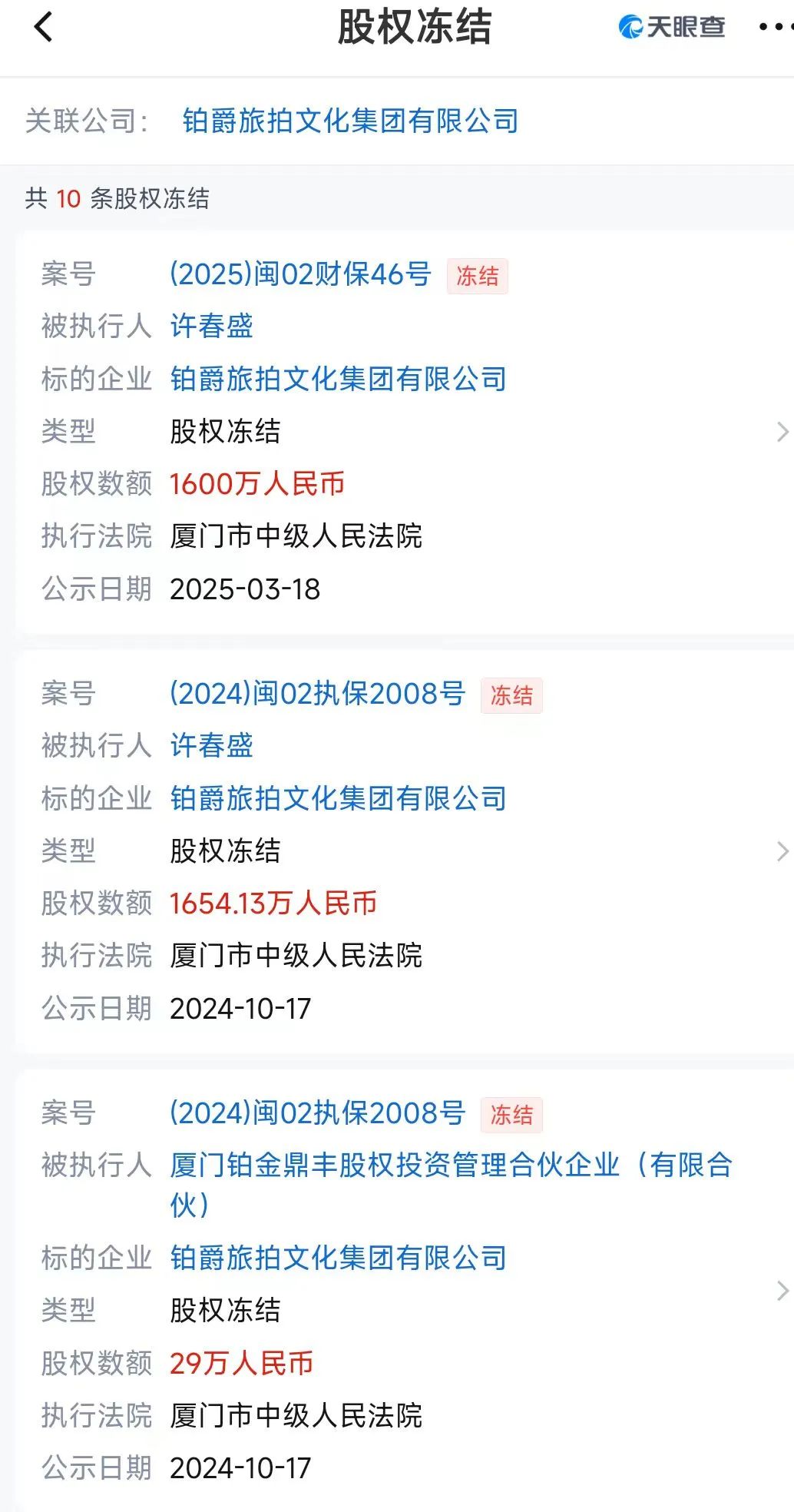 今年3月18日,铂爵旅拍被厦门市中级人民法院冻结1600万股权